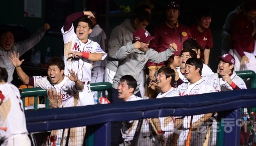 넥센이 7일 목동구장에서 열린 SK와의 와일드카드 결정 1차전에서 4-4로 맞선 연장 11회말 2사 만루서 상대 유격수 실책으로 결승점을 뽑아 준플레이오프 진출을 확정했다. 11회말 1사 2루서 스나이더의 4-4 동점 2루타가 터지자 덕아웃에선 함성과 환호성이 터졌다. 목동|김종원 기자 won@donga.com