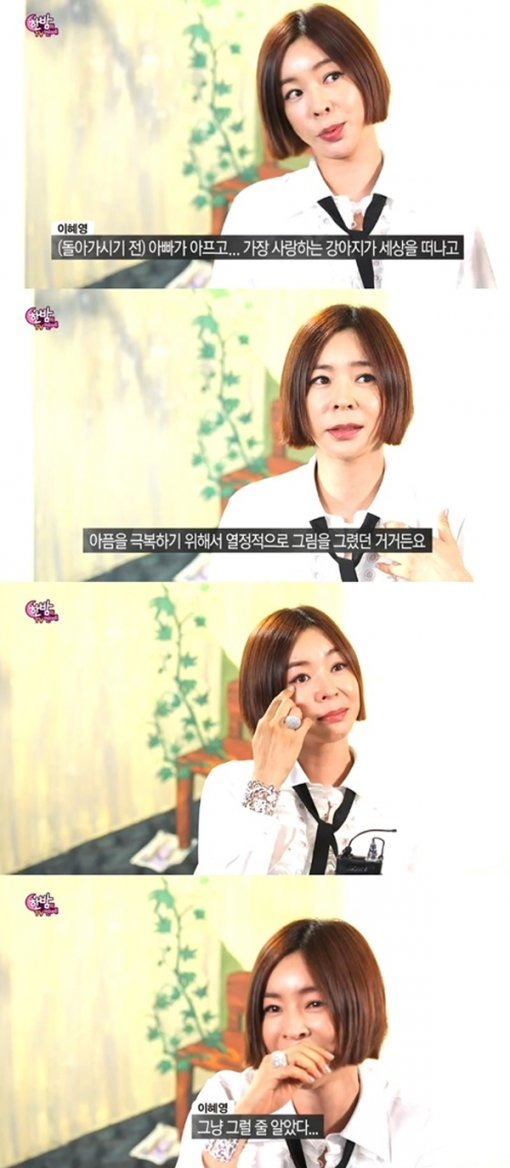 이혜영은 7일 방송된 SBS ‘한밤의 TV연예’에서 화가로 데뷔한 이유를 묻자, “아버지가 돌아가시기 전 아프셨고 가장 사랑하는 강아지가 세상을 떠났다”고 운을 뗐다.
