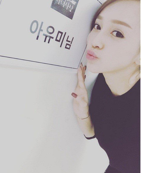 공개된 사진 속 아유미는 ‘마녀사냥 아유미님’이라고 적힌 대기실 앞에서 뽀뽀를 하듯 귀여운 표정으로 카메라를 응시하고 있다.