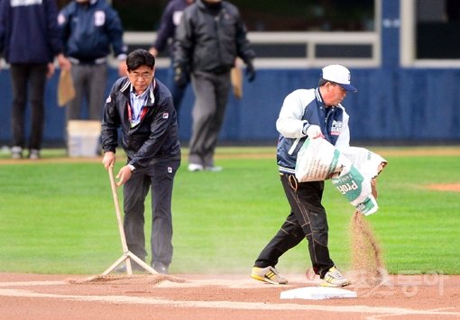 11일 서울 잠실야구장에서 '2015 타이어뱅크 KBO리그 포스트시즌' 준플레이오프 2차전 넥센 히어로즈와 두산 베어스의 경기가 열렸다. 8회초 넥센 박동원의 공격 중 내린 폭우가 그치자 관리요원들이 그라운드 정비를 하고 있다.