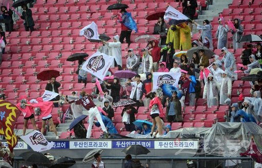 11일 서울 잠실야구장에서 '2015 타이어뱅크 KBO리그 포스트시즌' 준플레이오프 2차전 넥센 히어로즈와 두산 베어스의 경기가 열렸다. 8회초 넥센 박동원의 공격 중 폭우로 경기가 중단된 상황에서 넥센 응원단이 열정적인 응원을 펼치고 있다.