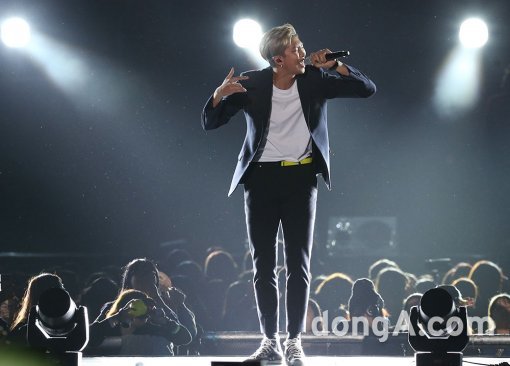 그룹 방탄소년단의 랩몬스터가 11일 오후 부산아시아드주경기장에서 열린 2015 아시아 송 페스티벌에서 화려한 무대를 꾸미고 있디.