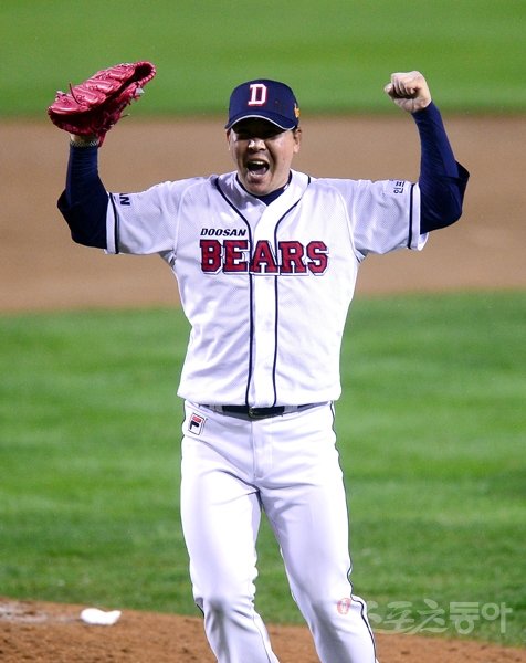 11일 서울 잠실야구장에서 ‘2015 타이어뱅크 KBO 리그’ 준플레이오프 2차전 넥센히어로즈와 두산베어스 경기가 열렸다. 3-2 승리를 지켜낸 두산 이현승이 환호하고 있다. 잠실|김종원기자 won@donga.com