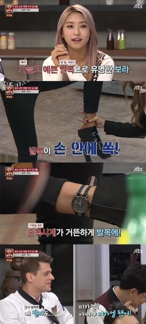 이날 방송에서 보라의 발목이 화제에 올랐고 하니는 “실제로 본 여성 중 최고의 워너비 몸매”라고 극찬했다.