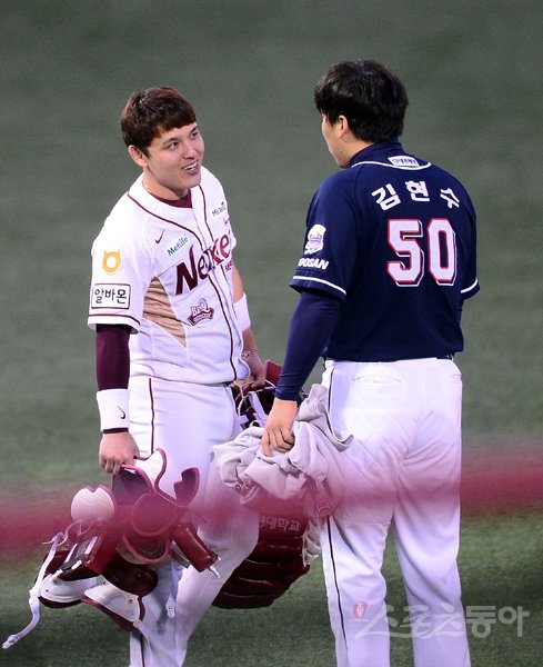 13일 서울 목동야구장에서 '2015 타이어뱅크 KBO 리그' 준플레이오프 3차전 넥센히어로즈와 두산베어스 경기가 열렸다. 경기 전 넥센 박동원과 두산 김현수가 이야기를 나누고 있다.