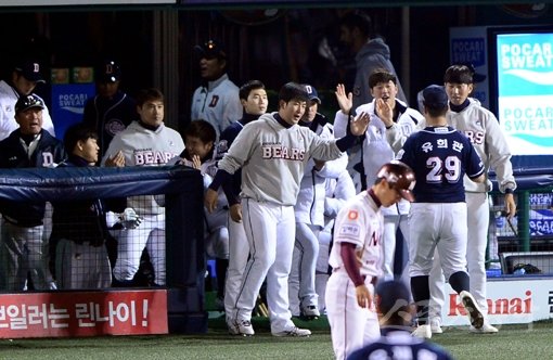 13일 서울 목동야구장에서 '2015 타이어뱅크 KBO리그 포스트시즌' 준플레이오프 3차전 넥센 히어로즈와 두산 베어스의 경기가 열렸다. 1회말 3안타를 맞았지만 무실점으로 막은 두산 선발 유희관이 더그아웃으로 들어가며 동료들의 축하를 받고 있다.