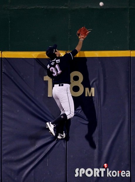 13일 서울 목동야구장에서 열린 `2015 타이어뱅크 KBO 리그` 넥센 히어로즈와 두산 베어스 준플레이오프 3차전 경기 3회말 1사에서 넥센 서건창의 타구를 잡기 위해 두산 중견수 정수빈이 뛰어 올랐으나 공은 담장을 넘어가고 있다.