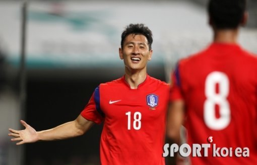 13일 오후 서울월드컵경기장에서 열린 축구 국가대표팀 친선 평가전 대한민국과 자메이카의 경기에서 한국의 지동원이 전반전 35분 정우영(8)의 코너킥을 헤딩슛으로 골인을 시키고 기뻐하고 있다.