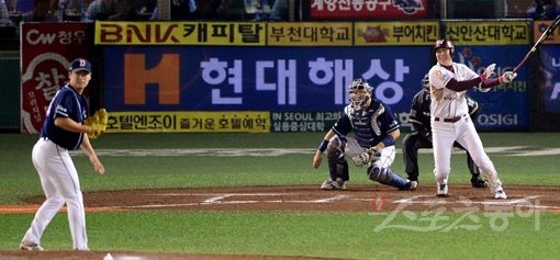 13일 서울 목동야구장에서 '2015 타이어뱅크 KBO리그 포스트시즌' 준플레이오프 3차전 넥센 히어로즈와 두산 베어스의 경기가 열렸다. 7회말 2사 1루에서 넥센 유한준이 1타점 2루타를 치고 있다.
