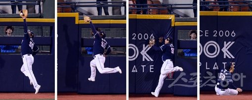 거의 다 잡았는데… 두산 김현수가 13일 목동구장에서 열린 넥센과의 준PO 3차전 1회말 1사 1루서 윤석민의 외야 깊숙한 타구를 점프해 잡아냈지만 펜스에 부딪히면서 공을 놓치고 있다. 두산이 포구 후 공을 떨어뜨린 것이라며 심판합의판정을 신청했지만 안타로 처리됐다. 목동|김종원 기자 won@donga.com