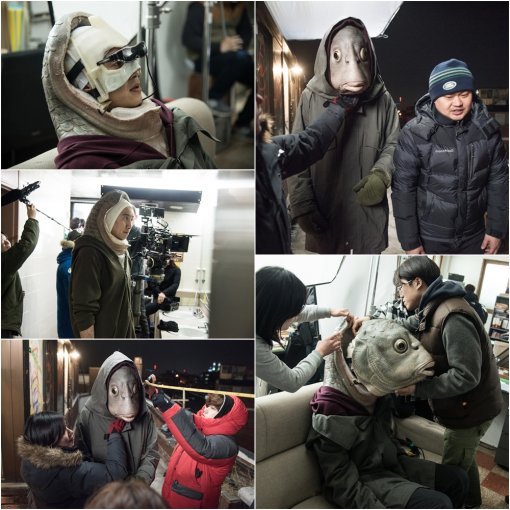 사진 속 이광수는 생선 탈을 쓰고 영화 ‘돌연변이’ 촬영을 준비하는 모습이다. 그가 현장에서 꼼꼼하게 동선을 확인하고, 사전 리허설을 하는 장면도 포착됐다. 8kg에 육박하는 무거운 생선 탈을 착용하면 앞이 보이지 않는 것은 물론, 호흡하기조차도 쉽지 않기 때문.