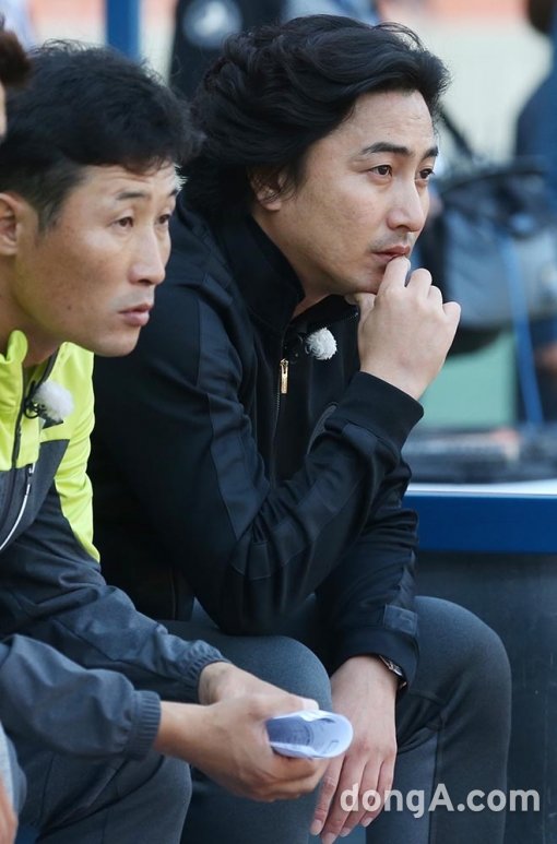 청춘FC의 안정환감독이 14일 오후 서울 잠실 올림픽주경기장에서열린 K리그 챌린지 선발팀과 청춘FC 헝그리일레븐 자선 경기를보고있다.