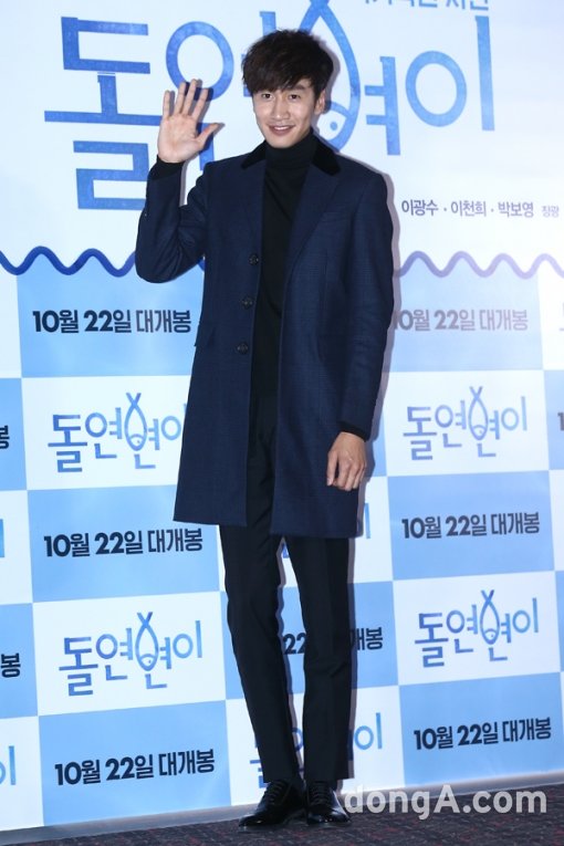 배우 이광수가 14일 오후 서울시 성동구 왕십리CGV에서 열린 영화 '돌연변이' 언론시사회에 참석해 포토타임을 하고 있다.