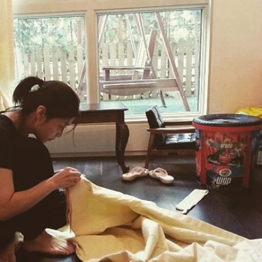 공개된 사진 속 송윤아는 편안한 의상을 입고 무릎을 꿇은 채 바느질을 하고 있다. 주부로서의 송윤아 모습이 시선을 모은다.