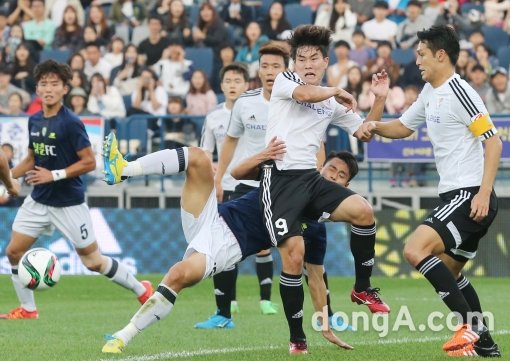 청춘FC의 지경훈과 K리그 챌린지 선발팀의 조성준이 14일 오후 서울 잠실 올림픽주경기장에서 열린 K리그 챌린지 선발팀과 청춘FC 헝그리일레븐 자선 경기에서 볼을 다투고 있다.