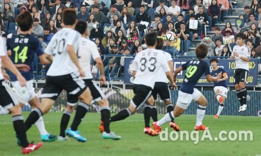 청춘FC의 김동우가 14일 오후 서울 잠실 올림픽주경기장에서 열린 K리그 챌린지 선발팀과 청춘FC 헝그리일레븐 자선 경기에서 센터링을 하고 있다.