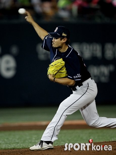 14일 오후 서울 목동야구장에서 열린 `2015 타이어뱅크 KBO 리그` 넥센 히어로즈 대 두산 베어스 준플레이오프 4차전 4회말 무사 1루에서 마운드에 오른 두산 노경은이 역투하고 있다.