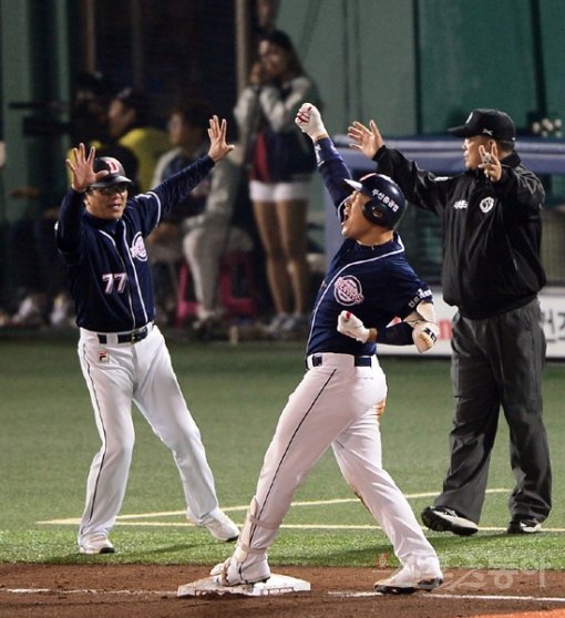 두산 양의지(가운데)가 14일 목동구장에서 열린 넥센과의 준PO 4차전에서 8-9로 뒤진 9회초 1사 1·3루서 전세를 뒤집는 2루타를 때렸다. 양의지가 상대 좌익수 실책까지 겹쳐 10-9로 역전한 상황에서 3루에 도달해 환호하고 있다. 목동|김진환 기자 kwangshin00@donga.com