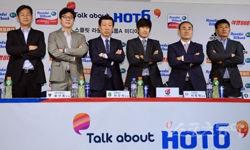 15일 서울 종로구 신문로 축구회관에서 ‘현대오일뱅크 K리그 클래식 2015’ 스플릿 라운드 그룹A 미디어데이가 열렸다. 6개 팀 감독들이 포즈를 취하고 있다. 왼쪽부터 최용수 FC서울 감독, 황선홍 포항스틸러스 감독, 최강희 전북현대 감독, 서정원 수원삼성 감독, 김학범 성남FC 감독, 조성환 제주유나이티드 감독. 33라운드로 정규 라운드를 마친 K리그 클래식은 이제 그룹A(상위 스플릿)와 그룹B(하위 스플릿)로 나눠 스플릿 라운드로 열전을 펼친다. 그룹A (전북현대, 수원삼성, 포항스틸러스, 성남FC, FC서울, 제주유나이티드)는 우승과 AFC 챔피언스리그 진출권을 두고 경쟁을 펼친다. 김진환 기자 kwangshin00@donga.com