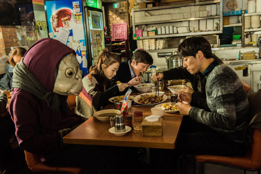 영화에서 이광수가 자신의 얼굴을 온전히 드러내는 장면은 두세 차례 뿐. 그것도 사진 속 모습이 전부다. 대신 특수 제작된 8kg의 ‘생선 탈’을 썼고, 매번 카메라 앞에 나서기 전 5시간씩 분장을 받았다. 상반신을 전부 특수 분장으로 꾸민 탓에 숨을 쉬기 어려워 촬영 때마다 산소통을 따로 매달기까지 했다.