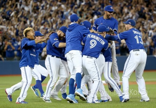 올 시즌 아메리칸리그의 패권은 토론토와 캔자스시티의 대결로 압축됐다. 토론토 선수들이 15일(한국시간) 로저스 센터에서 열린 텍사스와의 ALDS 최종 5차전에서 6-3으로 이겨 리그 챔피언십시리즈 진출에 성공한 직후 얼싸안고 기뻐하고 있다. 사진=ⓒGettyimages멀티비츠