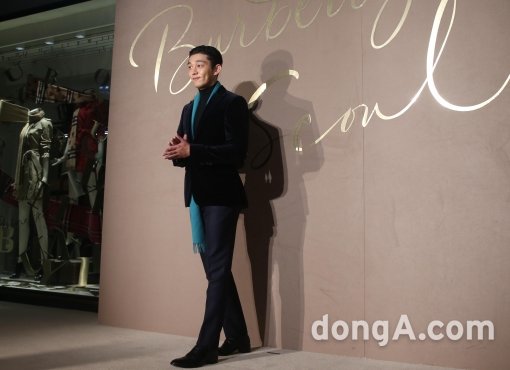 배우 유아인이 15일 오후 서울 강남구 청담사거리 버버리 서울 플래그십 오픈 이벤트에 참석해 포토타임을 하고 있다.