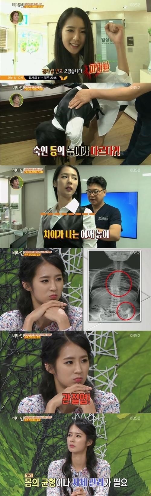 정형외과 전문의는 "나이가 아직 20대인데 벌써 관절염 소견이 있다"고 진단해 놀라움을 안겼다. 이어 "측만증이 있어 자세가 좋지 않아 더 균형에 대해 신경을 많이 써야 할 것"이라고 조언했다.
