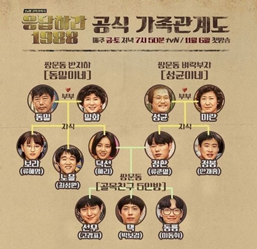 ‘응답하라 1988’ 제작진은 13일 채널 공식 인스타그램 계정을 통해 "최초 공개! ‘응답하라 1988’ 가족관계도 & 인물소개 쌍문동 골목길 식구들 동일이네, 성균이네, 골목친구 5인방 이들의 활약을 기대해주세요. 응답하라1988 성동일 이일화 김성균 라미란 류혜영 최성원 혜리 류준열 안재홍 고경표 박보검 이동휘”이라는 글과 사진을 올렸다.