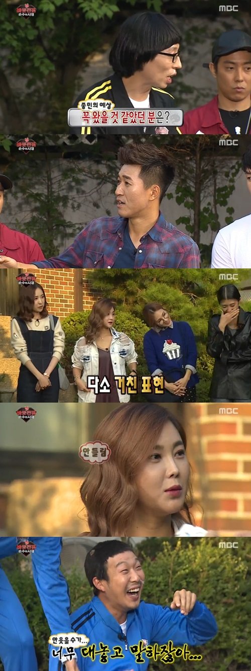 하지만 솔비는 이를 듣지 못했다. 이에 유재석은 김종민에게 “직접적인 표현은 삼가해달라”라고 지적했다.
