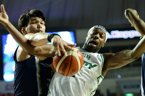 KCC 하승진(왼쪽)이 20일 전주체육관에서 벌어진 동부와의 홈경기 도중 로드 벤슨과 치열하게 볼을 다투고 있다. 사진제공|KBL