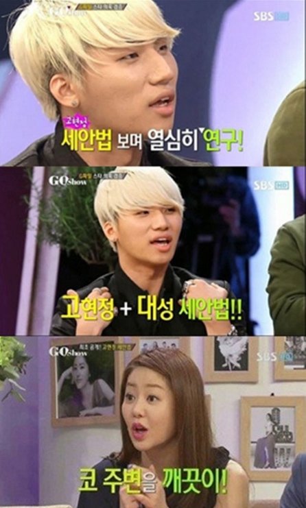 이에 고현정은 “코를 먼저 세안해야 한다. 잔털이 있는 부분을 공들여 세안해야 한다”며 “세안할 때 결 반대로 한다는 것에 신경 쓰면 너무 힘들지만 이마 위 머리털과 눈썹 세안을 신경 써야 한다. 그렇기 때문에 대성씨가 말한 세안법이 좋은거다”라고 덧붙여 원조 피부 관리의 고수로서 칭찬했다.
