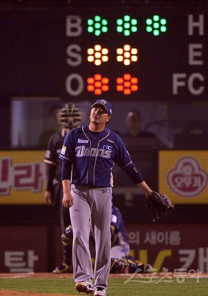 21일 서울 잠실야구장에서 '2015 타이어뱅크 KBO리그 포스트시즌' 플레이오프 3차전 NC 다이노스와 두산 베어스의 경기가 열렸다. 1회말 2사 1,3루에서 두산 오재원에게 볼넷을 허용한 NC 선발 손민한이 아쉬운 표정을 짓고 있다.