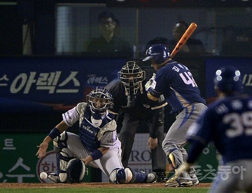 21일 서울 잠실야구장에서 '2015 타이어뱅크 KBO리그 포스트시즌' 플레이오프 3차전 NC 다이노스와 두산 베어스의 경기가 열렸다. 3회초 2사 1,2루에서 두산 포수 최재훈이 노경은이 던진 볼에 맞고 있다.