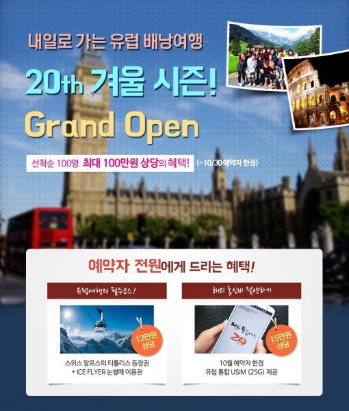 예약자 전원에게 스위스 알파스 티틀리스 등정권과 눈썰매 이용권, 유럽 통합 유심, 파리 몽쥬약국 할인 쿠폰, 시크 아웃렛 할인 쿠폰, 도시별 가이드북, 스위스 쉴트호른 할인쿠폰, 포토북 이용권 등을 제공한다.