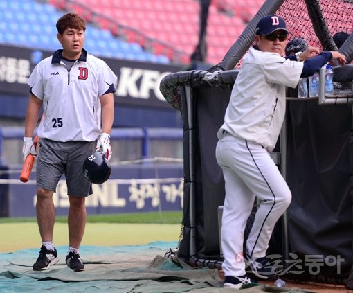 22일 서울 잠실야구장에서 '2015 타이어뱅크 KBO리그 포스트시즌' 플레이오프 4차전 NC 다이노스와 두산 베어스의 경기가 열린다. 경기 전 두산 양의지가 배팅 훈련을 마치고 더그아웃으로 들어가고 있다.