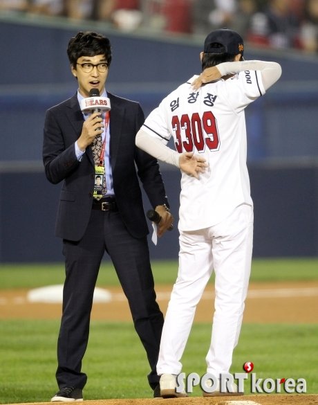 22일 오후 서울 잠실구장에서 열린 2015 타이어뱅크 KBO리그 포스트시즌 플레이오프 4차전 두산 베어스와 NC 다이노스의 경기에서 배우 임창정이 시구에 앞서 승승장구를 뜻하는 자신의 백넘버를 표출하고 있다.