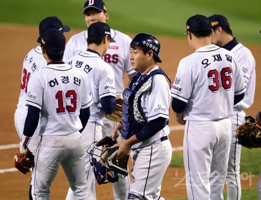 22일 서울 잠실야구장에서 '2015 타이어뱅크 KBO 리그' 플레이오프 4차전 NC다이노스와 두산베어스 경기가 열렸다. 두산 포수 양의지가 선발 출장하고 있다.