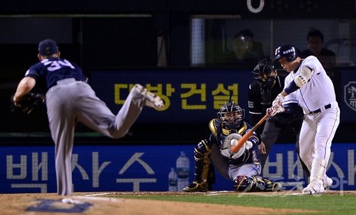 22일 서울 잠실야구장에서 '2015 타이어뱅크 KBO리그 포스트시즌' 플레이오프 4차전 NC 다이노스와 두산 베어스의 경기가 열렸다. 2회말 무사 1루에서 두산 양의지가 안타를 치고 있다.