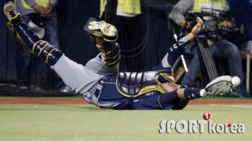22일 오후 서울 잠실구장에서 열린 2015 타이어뱅크 KBO리그 포스트시즌 플레이오프 4차전 두산 베어스와 NC 다이노스의 경기 두산 4회말 2사 1,2루에서 8번 대타 최주환의 파울타구를 NC 포수 김태군이 놓치고 있다.
