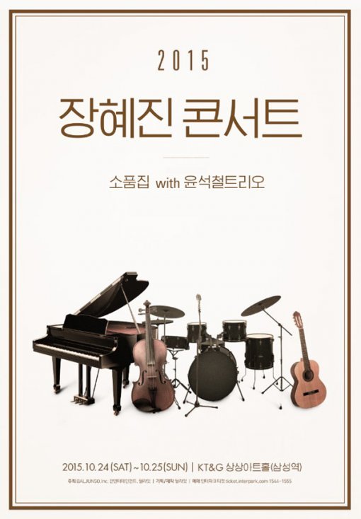 한편 ‘2015 장혜진 콘서트 소품집 with 윤석철 트리오’의 공연은 오는 24~25일 양일간 서울 강남구 대치동에 위치한 KT&G 상상아트홀에서 개최된다. 더불어 문화체육관광부에서 지원하는 공연티켓 1+1 지원사업에 선정, 온라인 사이트 인터파크를 통해 1장을 예매하면 추가 1장을 무료로 지원 받을 수 있다. 예매 1544-1555