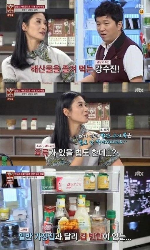 강수진의 냉장고에서는 일반 가정집 냉장고와는 달리 집 반찬을 찾아볼 수 없었고 흔히 볼 수 있는 고기도 볼 수 없었다.