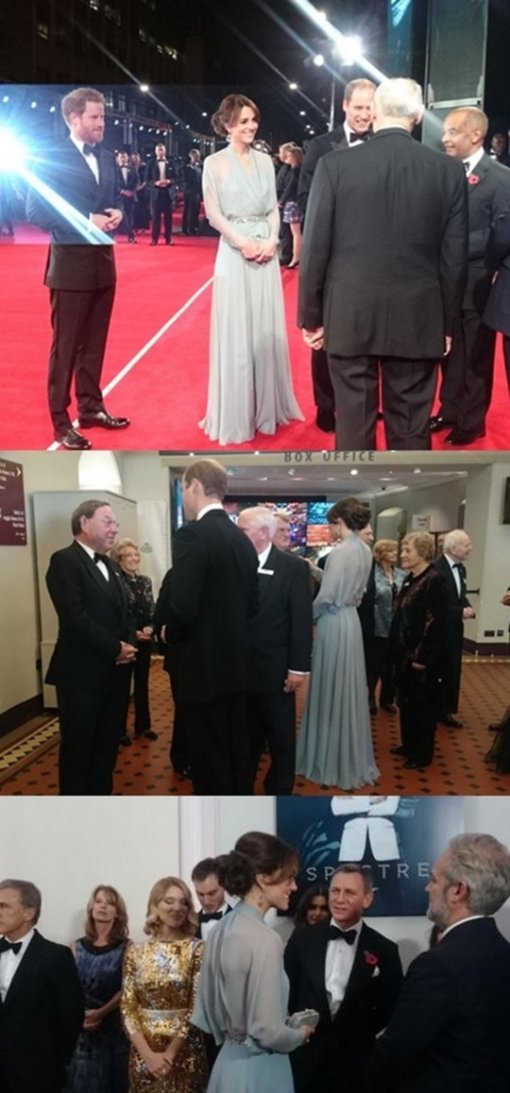케이트 미들턴은 26일 런던 로얄 알버트 홀에서 열린 제임스 본드 시리즈 영화 ‘007 스펙터(Spectre)’ 월드 프리미어에 남편인 영국 왕세손 윌리엄과 해리 왕자 등 영국 왕실 인사들과 함께 참석했다.