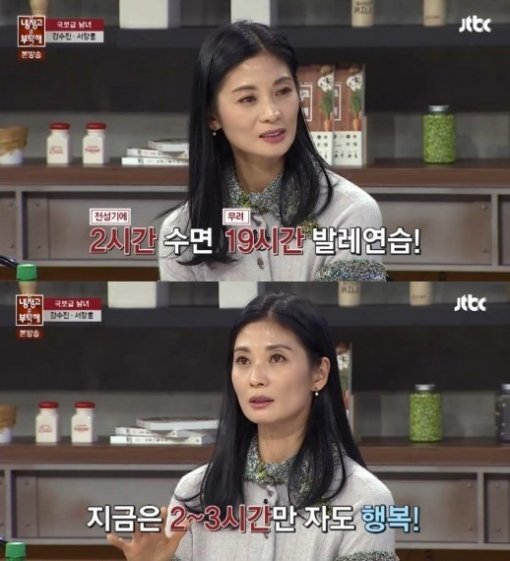 이날 방송에서 강수진은 “왜 그런지는 몰라도 시간이 없어서 못 잤다”면서 “그러다보니 습관이 되어 지금은 2~3시간만 자도 행복하다. 나도 내가 살아있는 게 신기하다”고 밝혔다.
