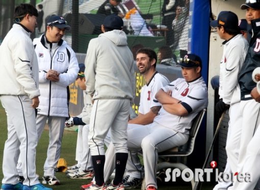 27일 오후 대구 시민야구장에서 열리는 `2015 타이어뱅크 KBO 리그` 삼성 라이온즈 대 두산 베어스 한국시리즈 2차전에 앞서 훈련에 나선 두산 선발 니퍼트가 동료들과 얘기를 하며 미소짓고 있다.