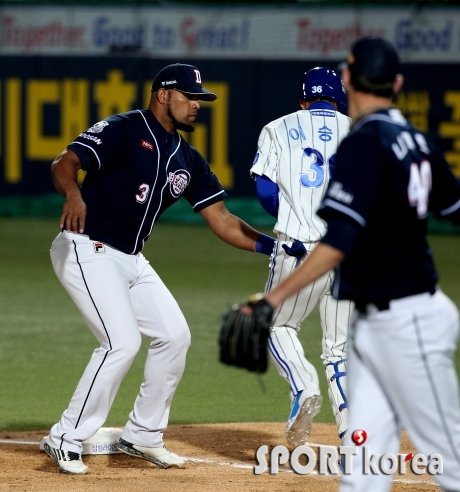 27일 오후 대구 시민야구장에서 열린 `2015 타이어뱅크 KBO 리그` 삼성 라이온즈 대 두산 베어스 한국시리즈 2차전 2회말 1사에서 삼성 이승엽의 내야땅볼을 토스받은 두산 1루수 로메로가 태그아웃시키고 있다.