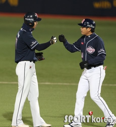 오재원 2루타! 강동우 코치 ‘잘했어’