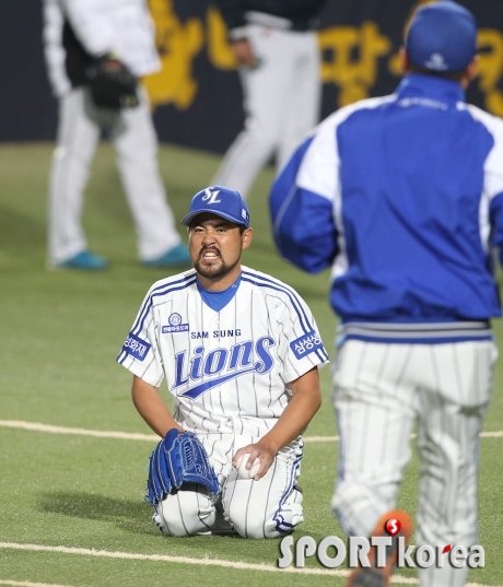 27일 오후 대구 시민야구장에서 열린 `2015 타이어뱅크 KBO 리그` 삼성 라이온즈 대 두산 베어스 한국시리즈 2차전 5회초 2사 만루에서 두산 박건우의 타구에 맞은 삼성 선발 장원삼이 고통스러워하고 있다.