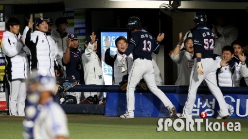 27일 오후 대구 시민야구장에서 열린 `2015 타이어뱅크 KBO 리그` 삼성 라이온즈 대 두산 베어스 한국시리즈 2차전 5회초 2사 만루에서 두산 민병헌의 2타점 적시타로 홈을 밟은 허경민과 김재호가 덕아웃 동료들의 환영을 받고 있다.