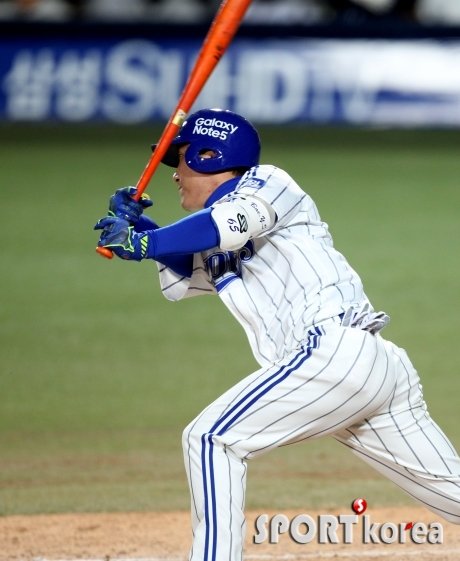 27일 오후 대구 시민야구장에서 열린 `2015 타이어뱅크 KBO 리그` 삼성 라이온즈 대 두산 베어스 한국시리즈 2차전 8회말 1사에서 삼성 배영섭이 중전안타를 치고 있다.