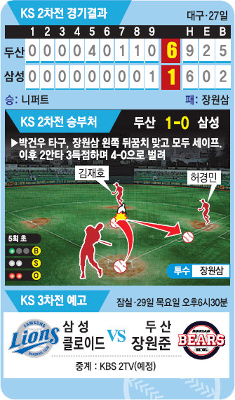 두산은 27일 대구구장에서 열린 ‘2015 타이어뱅크 KBO 포스트시즌’ 한국시리즈(KS·7전4선승제) 2차전에서 에이스 니퍼트의 완벽한 투구 속에 삼성을 6-1로 완파하고 1패 후 1승을 챙겼다.